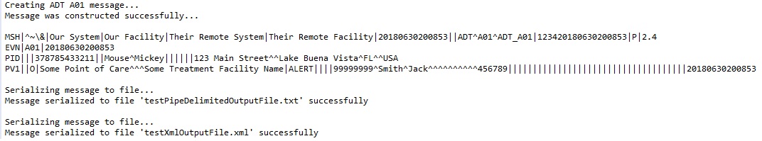 The results of running the above program is shown above. Running the program produces a HL7 message that is ready for transmission to a remote HL7 system. You can also inspect the two output files generated by the program to get an idea of what a pipe delimited HL7 file and XML formatted file looks like. Please note that the pipe delimited output file has special unprintable characters within it that help in the "message enveloping" that is required. You can inspect this file using any Hex editor if you are curious to see where these characters are in the file.